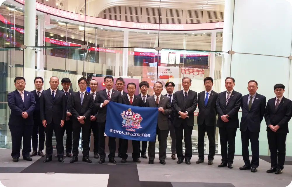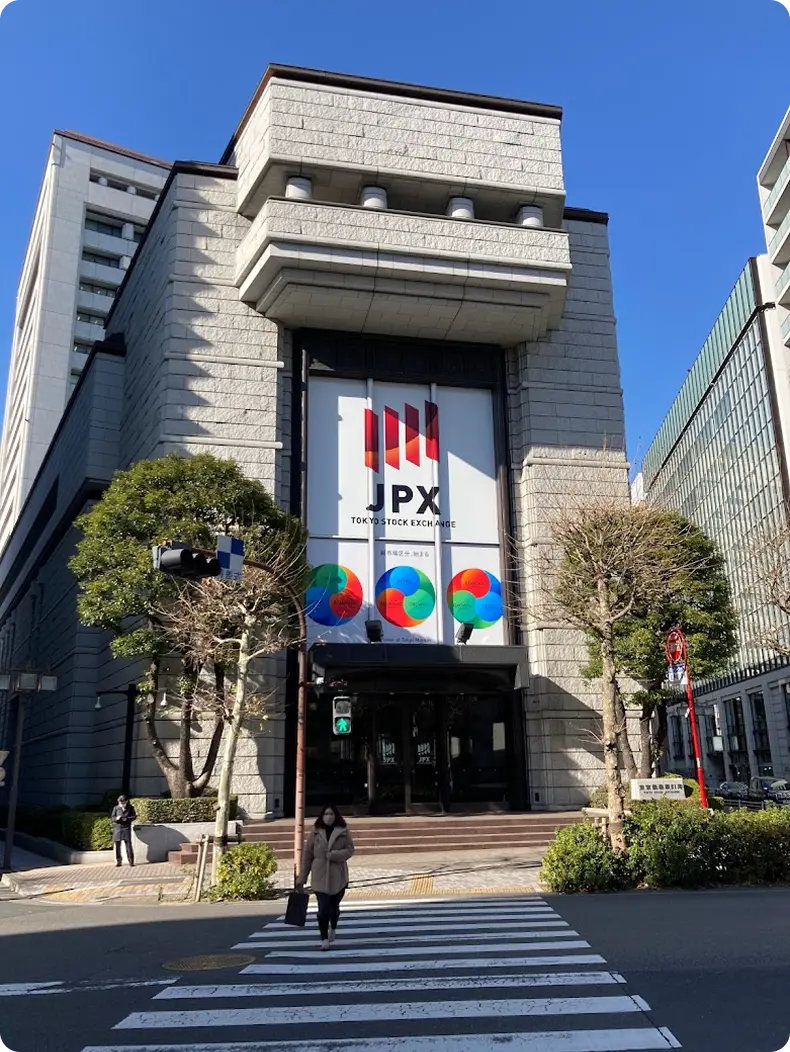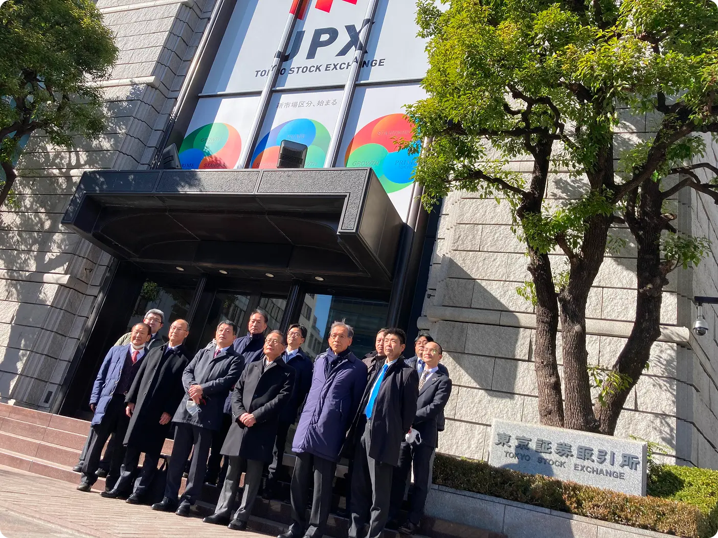 東京証券取引所の正面入口前で記念撮影を実施しました。