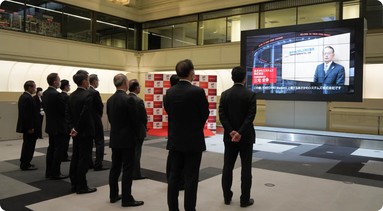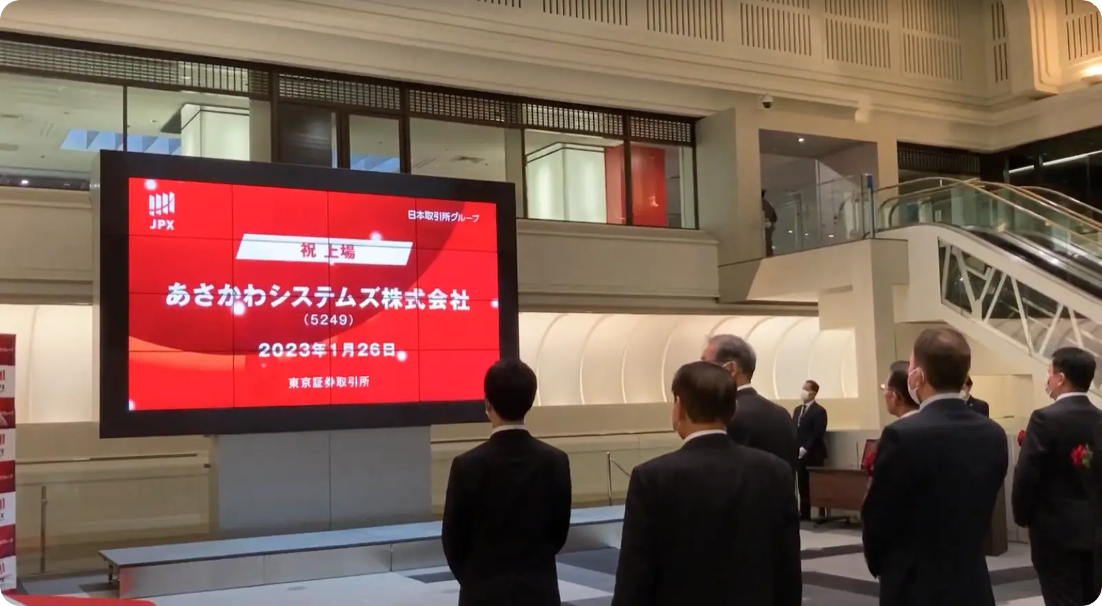 最初に大阪本社で撮影して、東証に提出した動画が前面の特大モニターに映し出されました。