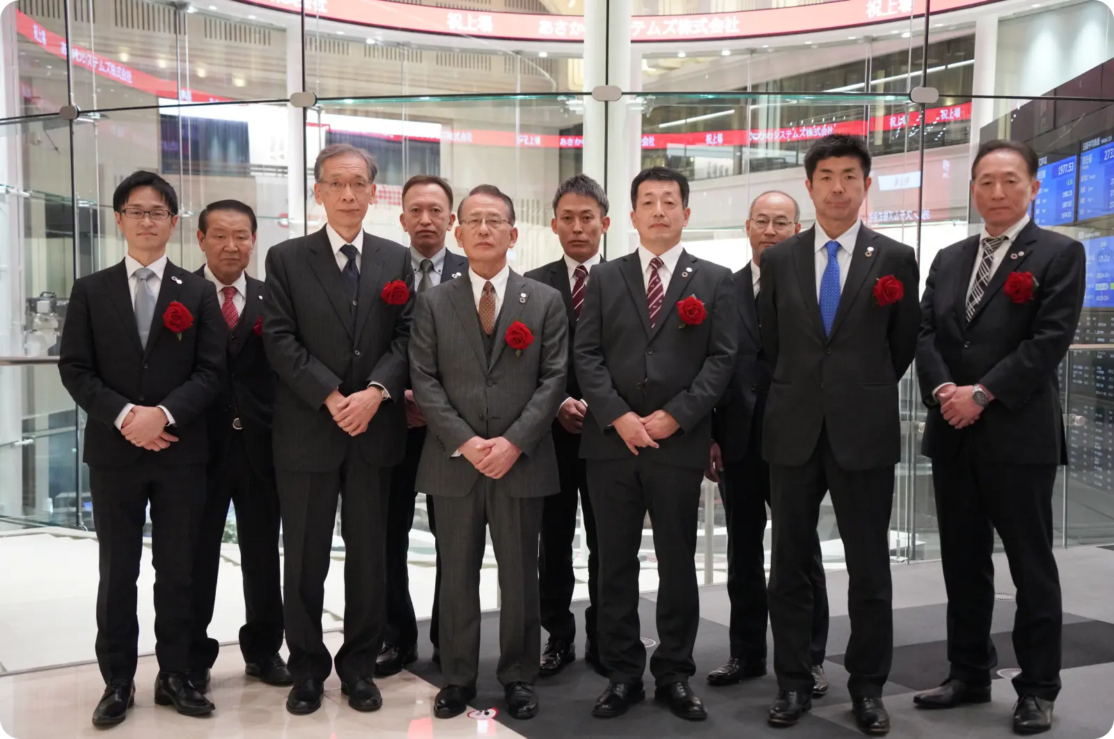 上場通知書をもって、特大モニター前で一枚