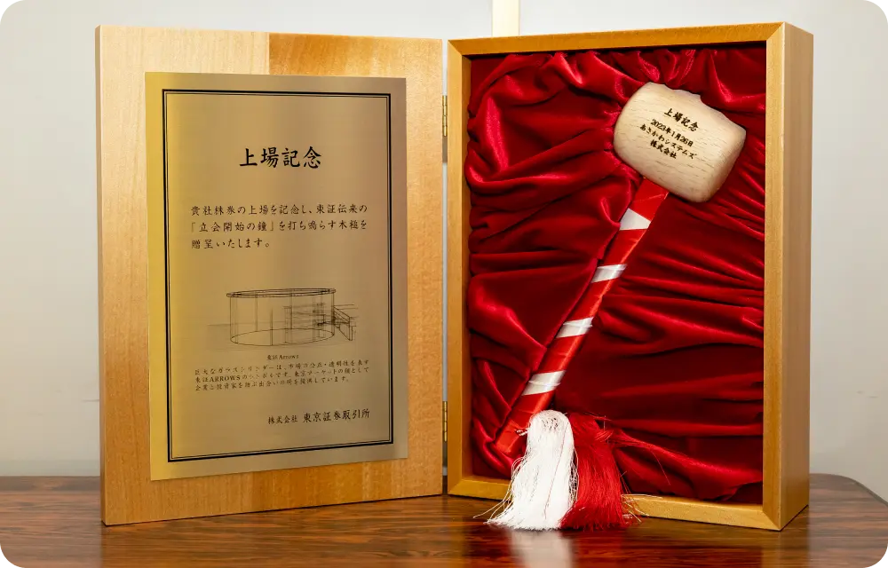 受領した上場通知書、「立会開始の鐘」を鳴らした木槌については、今も大阪本社の応接室で展示しております。